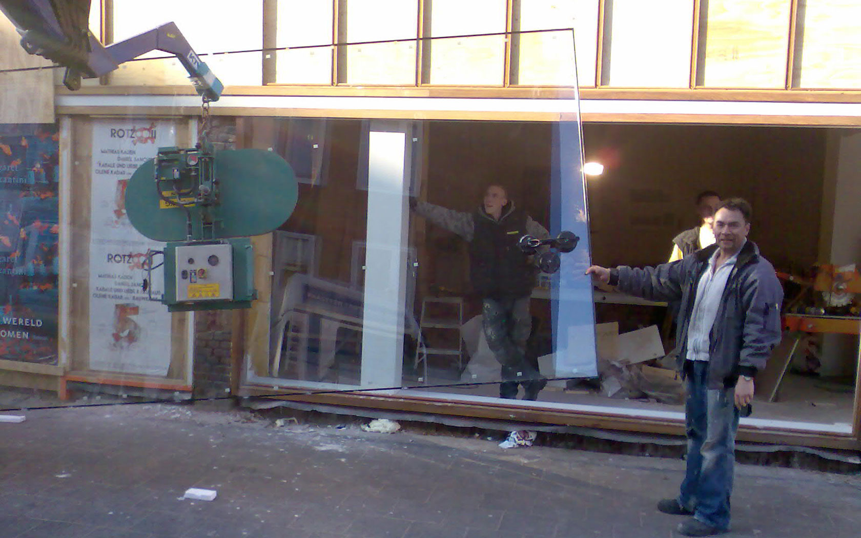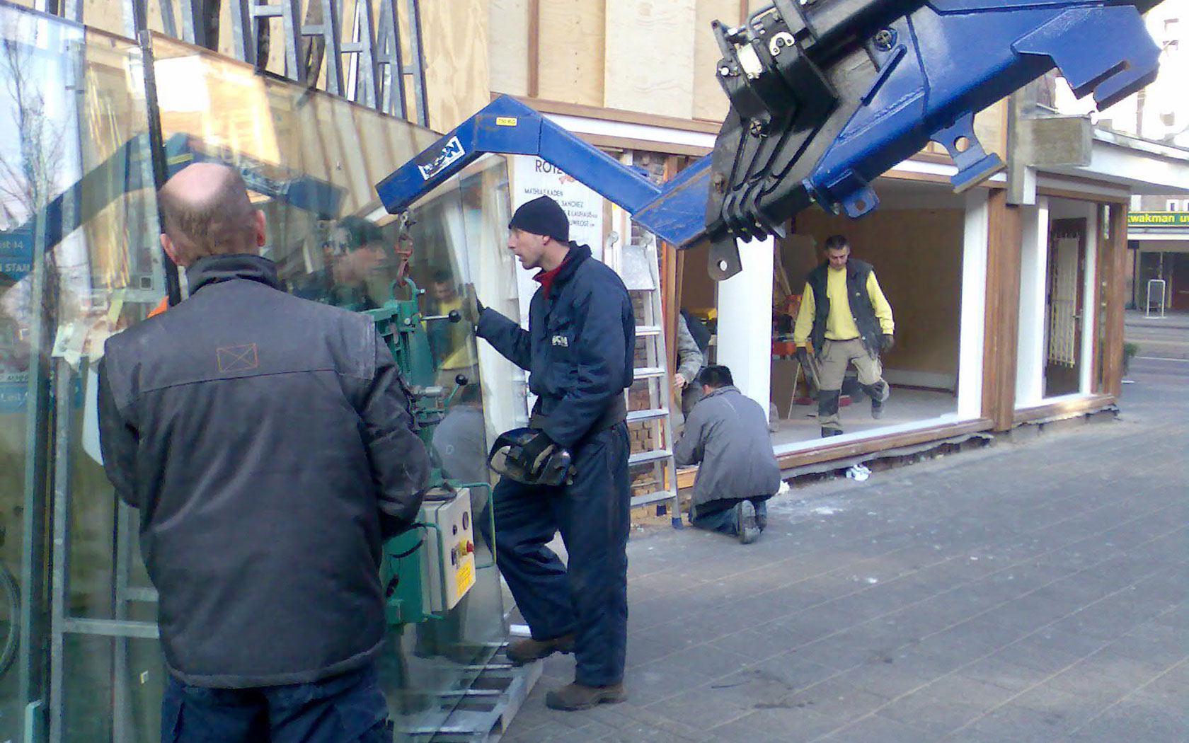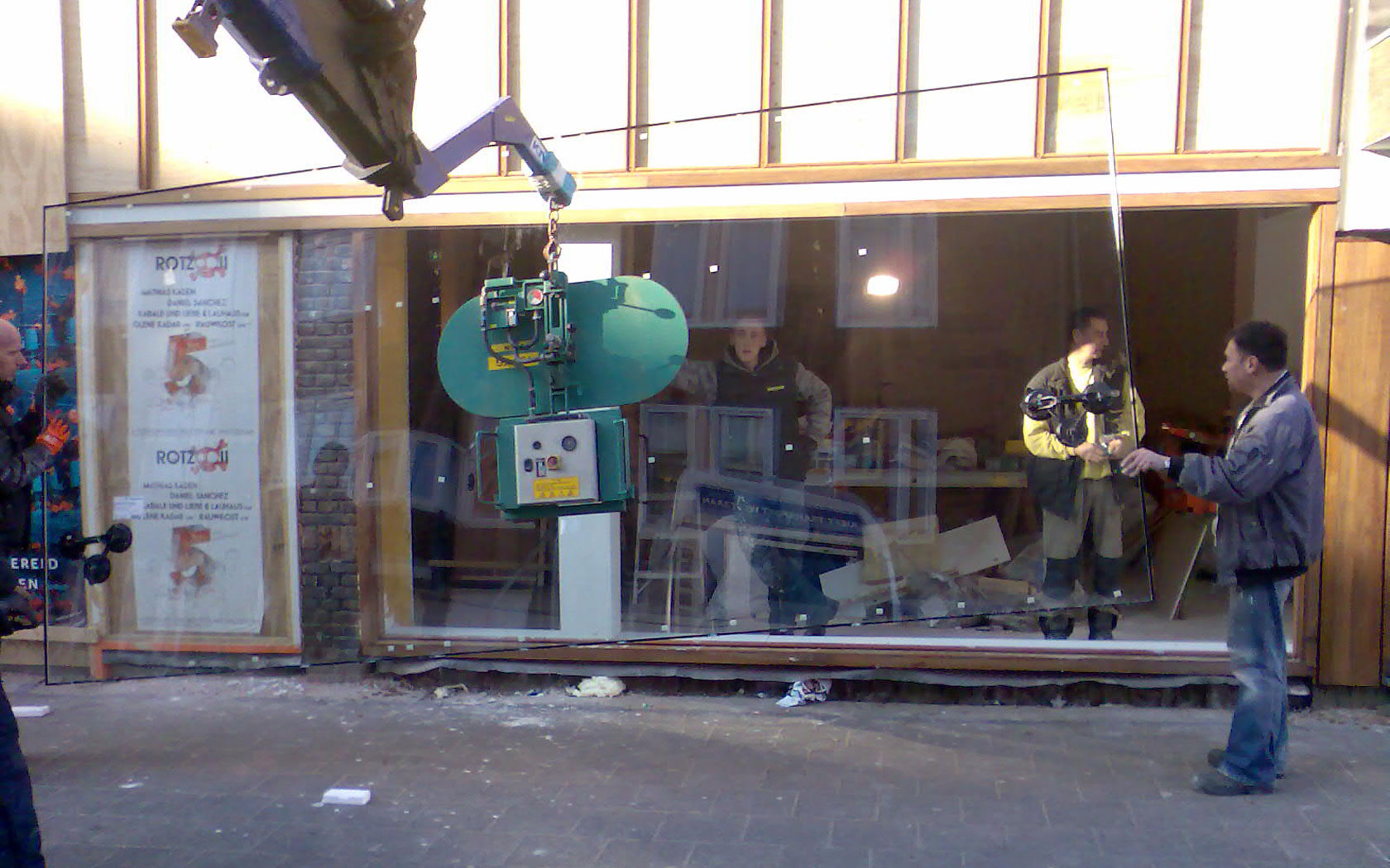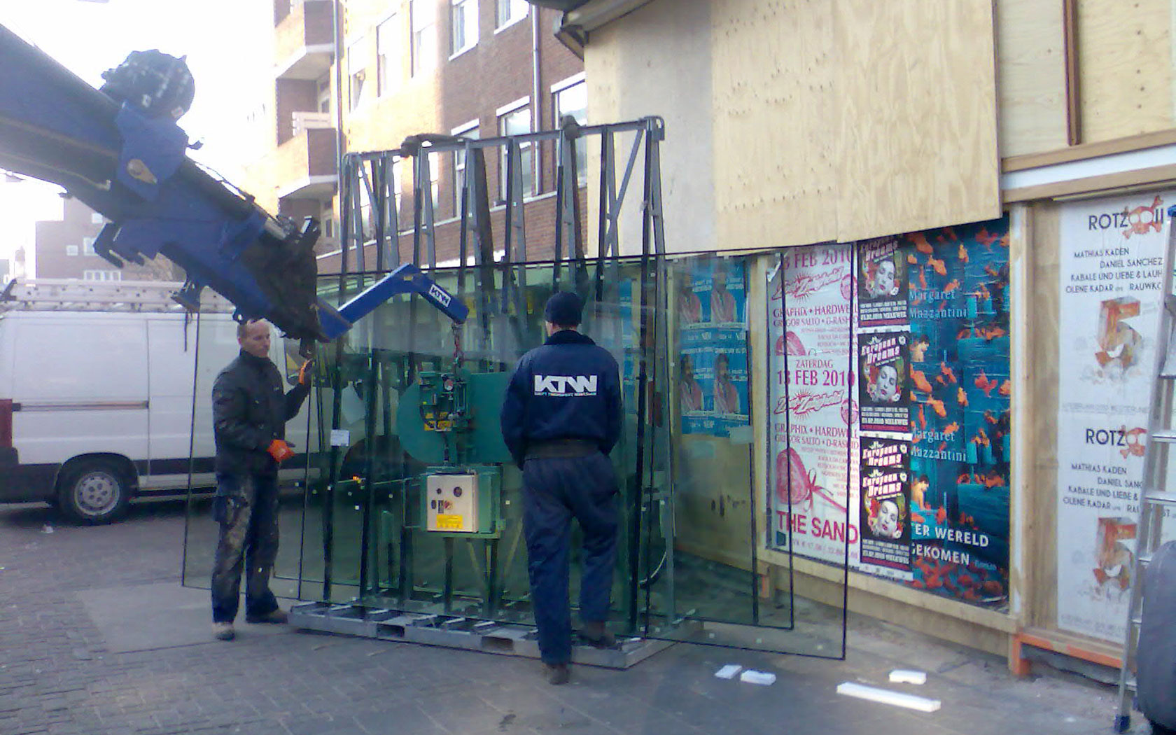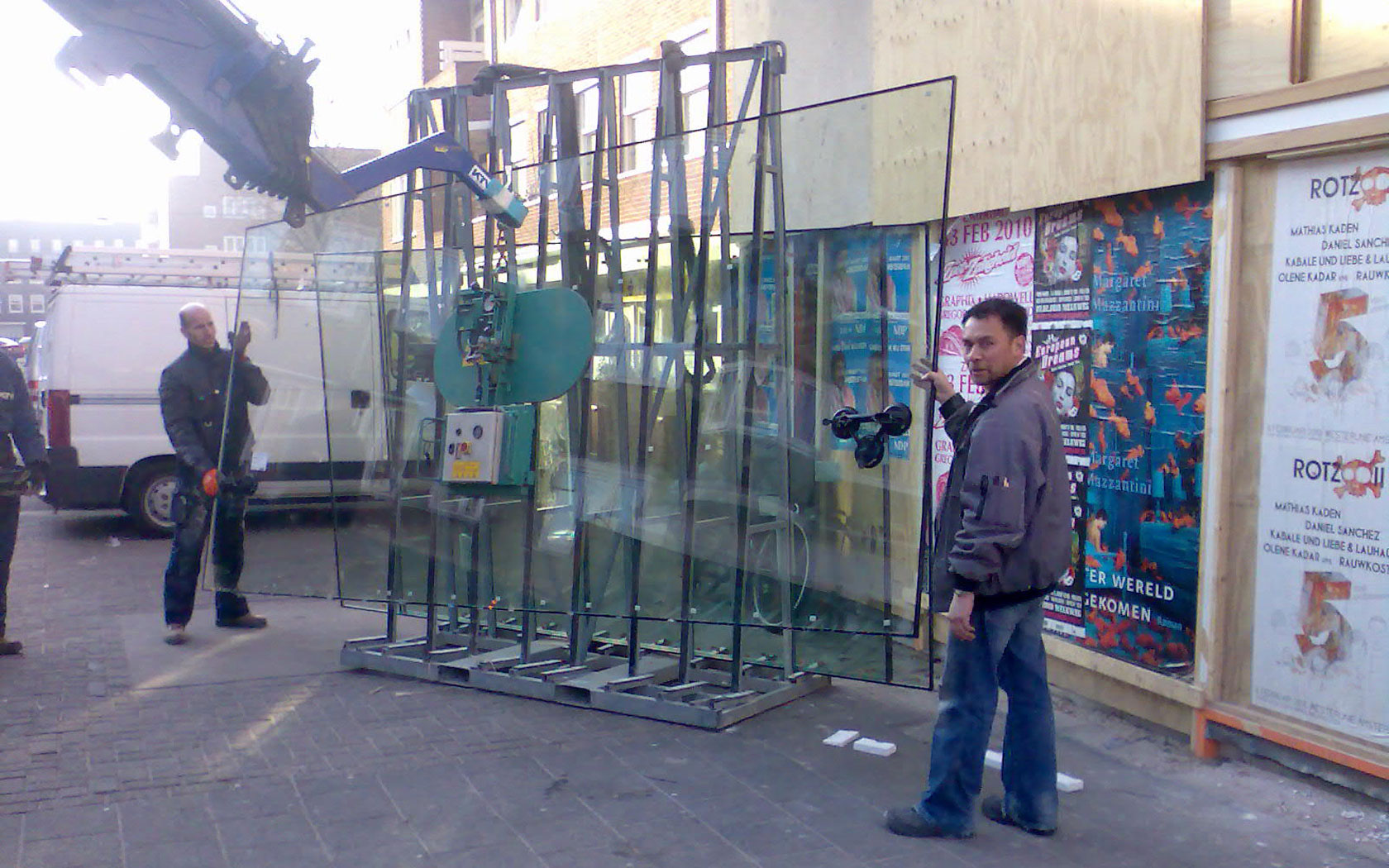 Hijswerk van glas op IJburg, in samenwerking met Kieft Transport Zaandam